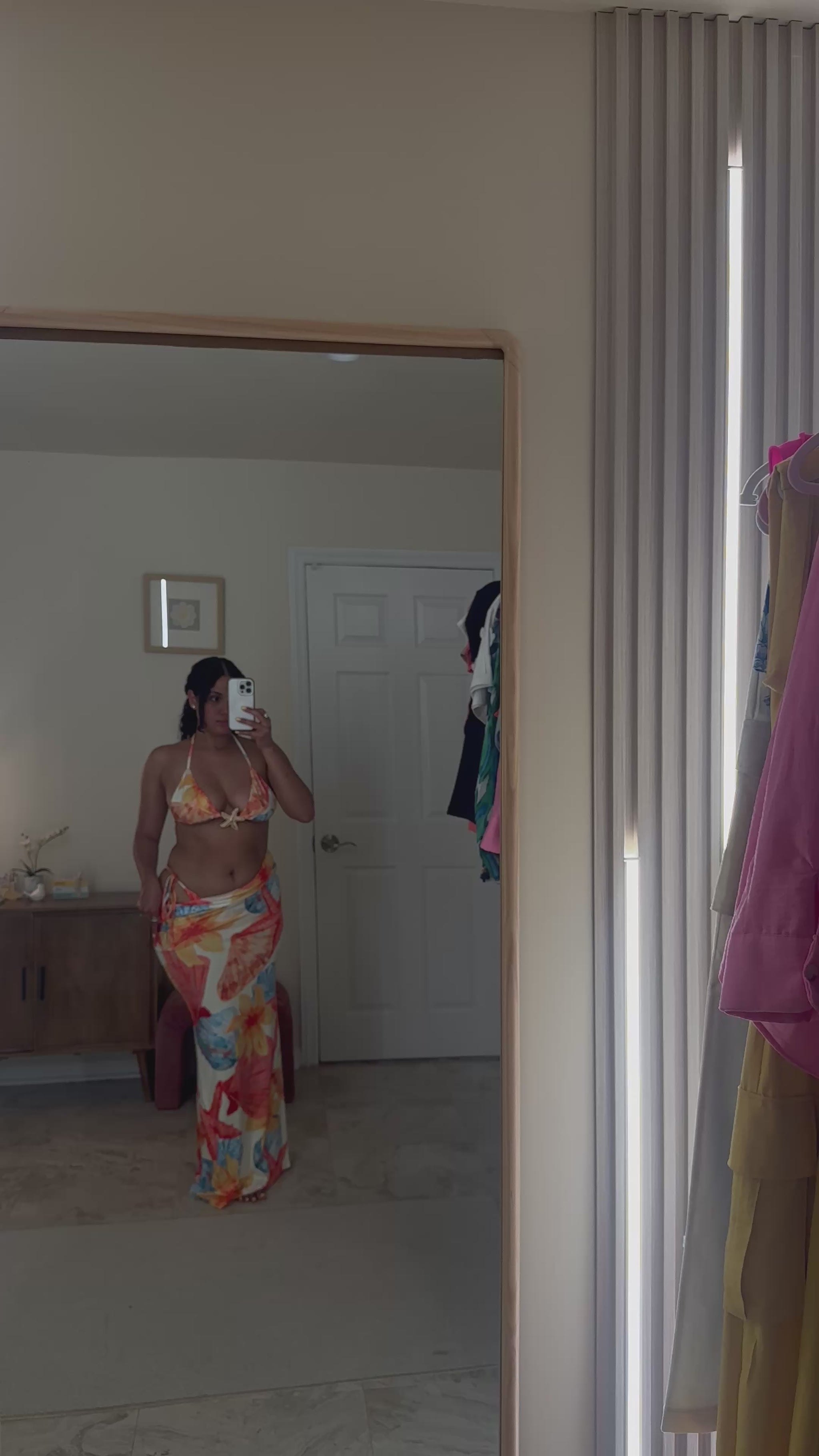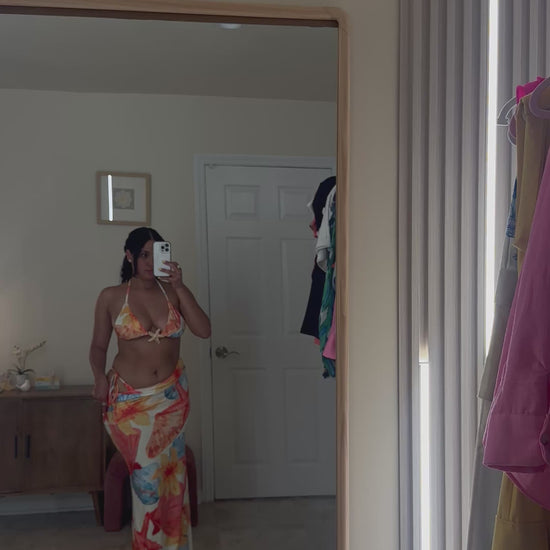 Get ready to turn heads with the Tropicana Bikini! This three-piece set features a trendy design perfect for summer. The bra, with its unique metal star detail, offers a flattering fit without any padding. Stand out on the beach in style with this playful and fashionable bikini.
